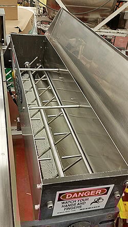 A simple example of the use of the Gotcha Stick is shown in the two illustrations. The device is a crumb catcher used at a bakery for collecting crumbs from a bake goods line. There was a guard on it with lots of signs saying danger and keep your hands out. But human nature was to think people could put their hands in if they are very careful, in spite of the signs. And employees did put their hands in the crumb catcher and their hands pinched in between the bars. In addition to human pain, these accidents cost money. So, this needed to be prevented. It was time for a machine assessment. The owner of the machine called Re:Build Optimation who sent in a safety technician to do a safety assessment. Among other tools he used a Gotcha Stick. Based on the pinch point, which was six inches down, the Gotcha stick recommended a 5/8 inch gap. You can see the revised guard in the second second picture. And after the change in guarding no one could get their fingers in close enough to get them pinched. No more Gotcha!