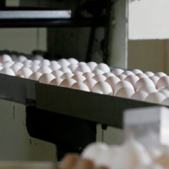 The system conveys eggs from laying houses to a processing building. In processing, every egg is washed, sanitized, weighed, and scanned by ultrasonic detectors. They are then sorted and shunted to bulk racks for restaurants or cartons for consumers.